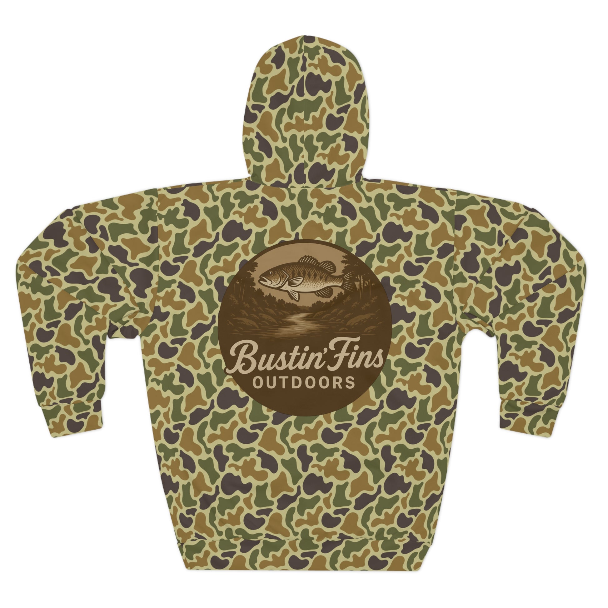 Camo Fishing Hoodie — "Bustin' Fins Outdoors" All-Over Print Pullover