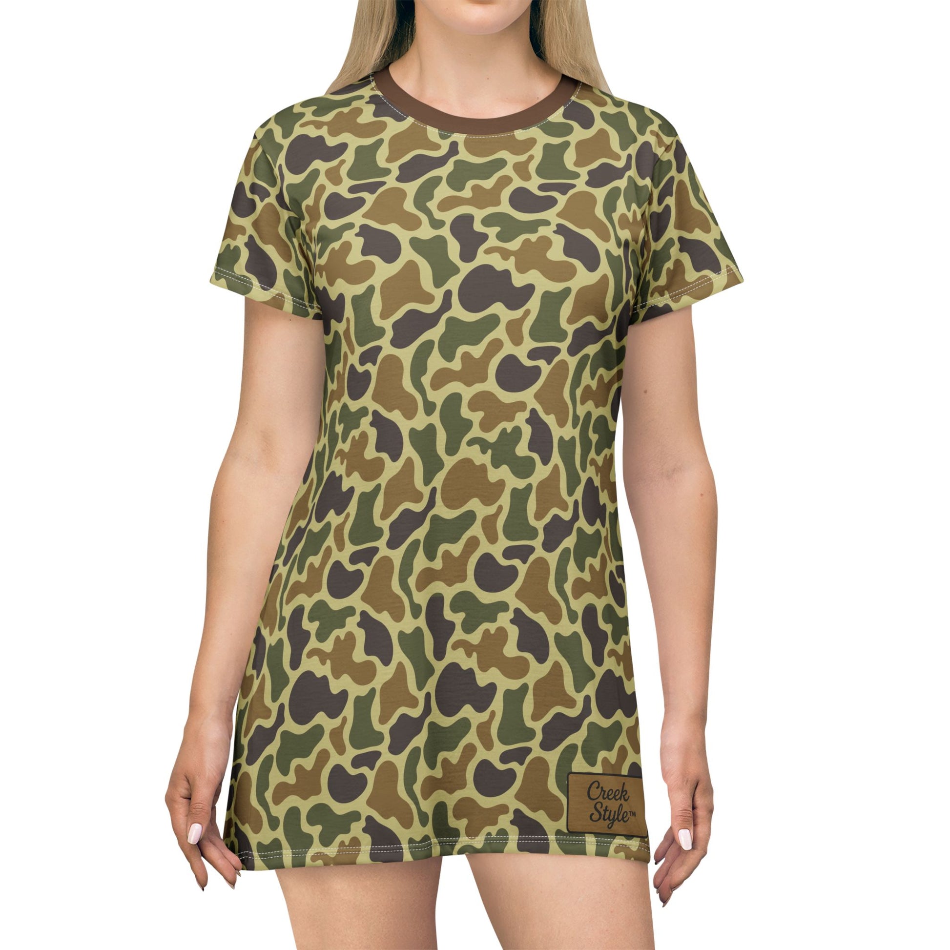 Elevate your casual wardrobe with this stylish T-Shirt Dress, designed for comfort and versatility. Its lightweight fabric drapes beautifully, making it perfect for any occasion, whether you're lounging at home or heading out with friends. The eye-catching camouflage pattern adds a trendy touch, resonating with those who embrace uniqueness in their style. Ideal for warm summer days, casual hangouts, or as a chic layering piece in cooler months. This dress fits seamlessly into the lives of active, fashion-forward individuals who appreciate contemporary designs. The T-Shirt Dress makes a lovely gift for birthdays or holiday celebrations, catering to those who love a blend of comfort, style and the outdoors.